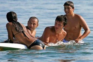 Cu el: primul drum la apa trebuie sa-l faceti impreuna! Lasa uleiul, daca-ti zice “hai in apa”. Iar daca ii zici tu “hai”, convinge-l sa-si scuture nisipul din adidasi alta data. Intrati imbratisati, poti sa chicotesti, sa te cuibaresti la pieptul lui, apoi sa-l stropesti, sa te joci ca un copil fericit.