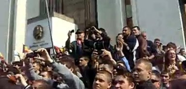 Parterul şi etajul I al Parlamentului de la Chişinău, o clădire cu nouă etaje, au fost incendiate, iar protestatarii au arborat un drapel al României şi unul al Uniunii Europene pe sediul Preşedinţiei moldovene, înlocuind drapelul Republicii Moldova.